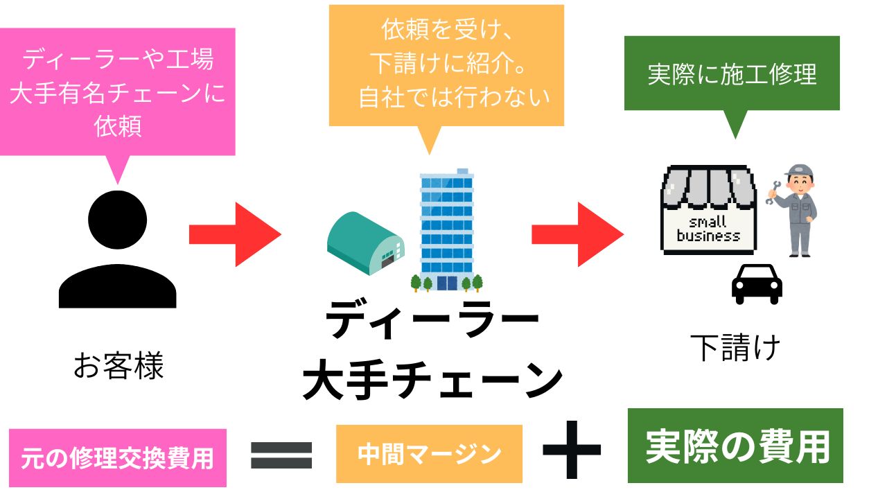 (ディーラーに頼んでも、結局は板金屋に外注されて交換・修理します)