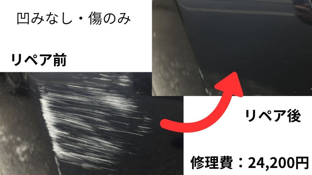 深いキズ:コインやカギなどで長く引きずったような深いキズは、ヘコミは直せてもタッチアップの跡が目立ちやすいため、あまりおすすめできません。
